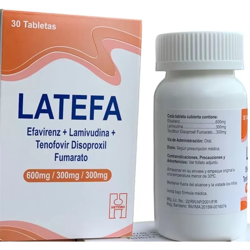 Latefa (tenofovir disoproxil, lamivudina y efavirenz) 300/300/600 mg frasco Con 30 Tabletas